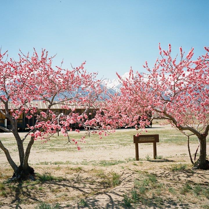 What was very chilling for me was going to Poston, Arizona. I hadn't done more research on Poston, but I had traveled about five hours to get there just to photograph the monument for Japanese American incarceration camp survivors. I went all the way there and realized that one of the camps was down the street, but it was really hard to find, at least on Google. There was no signage around the area, but I found a dropped pin from a Google review, and that's how I was able to find Poston Camp One, which you'll recognize from the very last image in the piece — the cranes on the fencing around the perimeter.